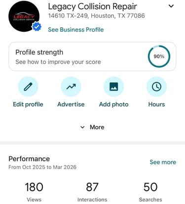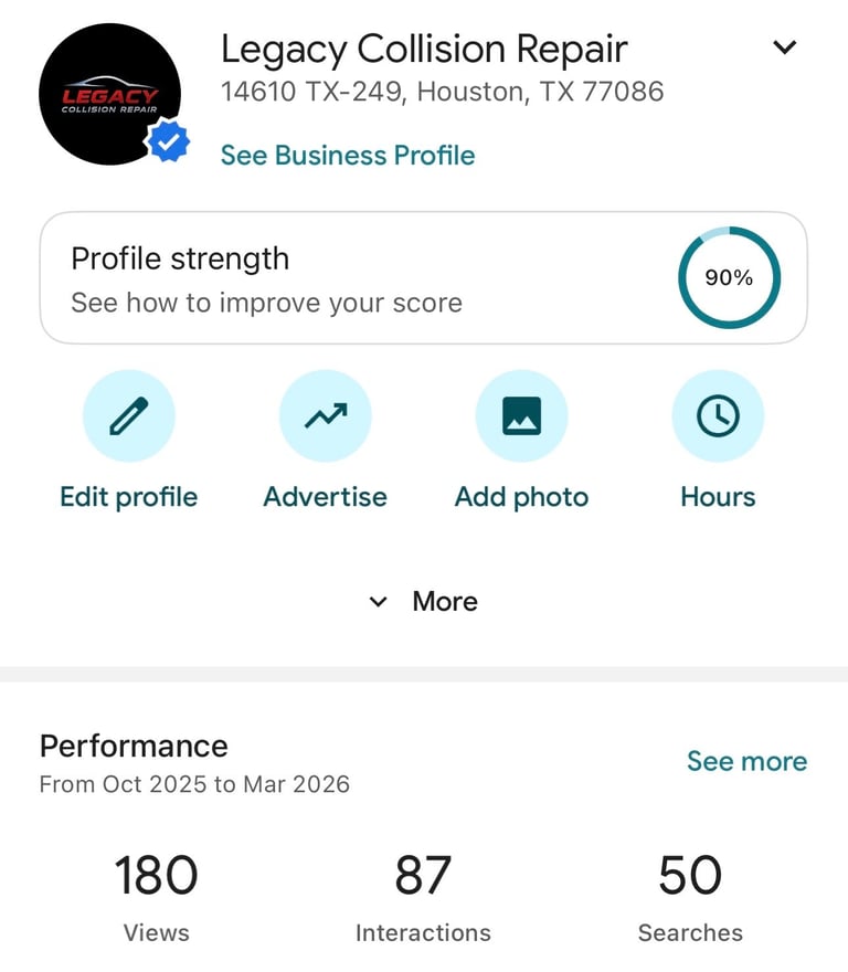 HypeWorx helped create and optimize Legacy Collision Repair’s Google Business Profile to improve local search engagement and visibility in Houston auto body searches. The optimized listing produced 180 profile views, 87 customer interactions, and 50 searches, showing increased engagement from customers actively searching for collision repair services.