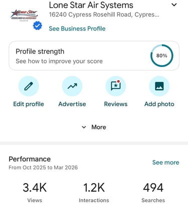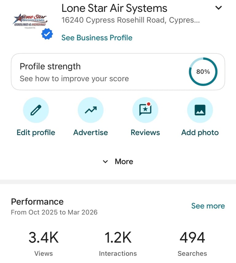 Through targeted Google Business Profile optimization, HypeWorx helped increase Lone Star Air Systems’ visibility in local HVAC searches. During this period the business generated 3.4K profile views, 1.2K customer interactions, and 494 Google searches, showing how strong local SEO and profile management can significantly increase customer engagement and service inquiries.