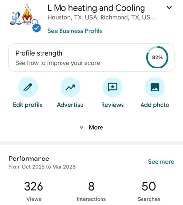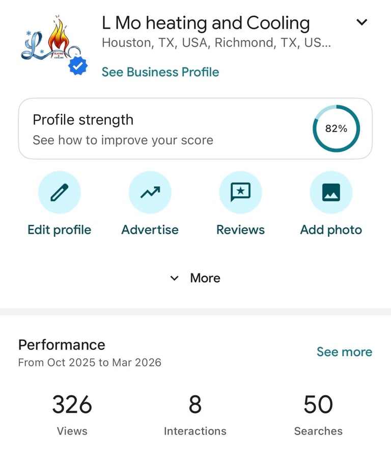 LMO Heating and Cooling saw increased search presence after implementing profile optimization and ongoing updates through HypeWorx. The profile generated 326 views and 50 searches, helping strengthen the company’s presence in local HVAC search results throughout the Houston and Richmond areas.
