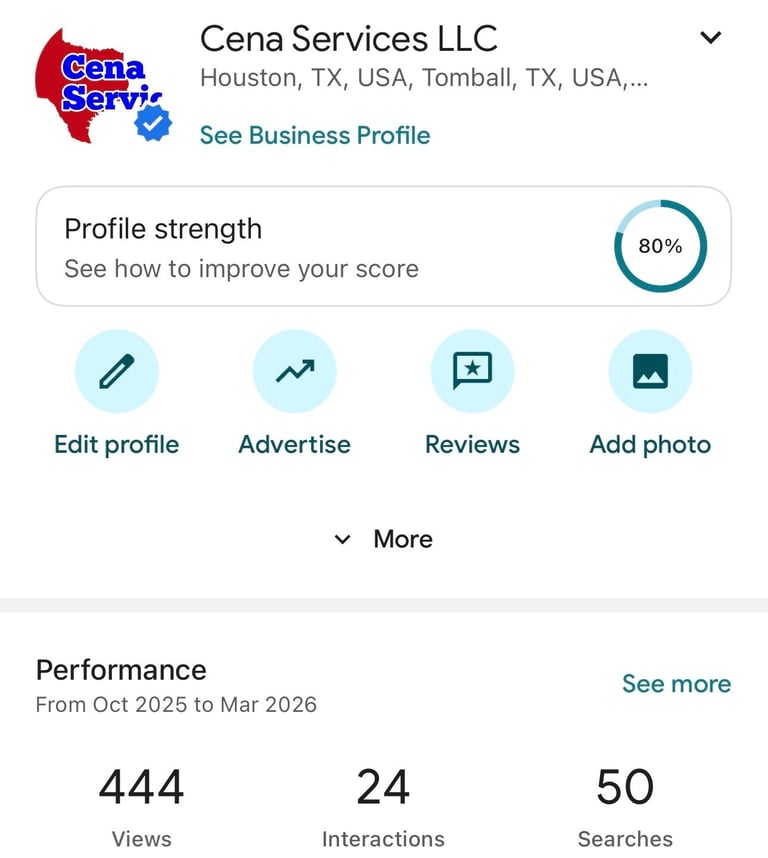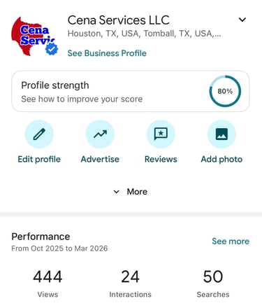 After implementing Google Business Profile optimization through HypeWorx, Cena Services began gaining increased local visibility across Houston and Tomball searches. In this performance snapshot, the listing generated 444 profile views, 50 Google searches, and 24 customer interactions, demonstrating how improved profile optimization and search visibility can drive real engagement from potential customers.